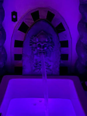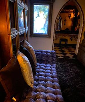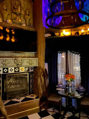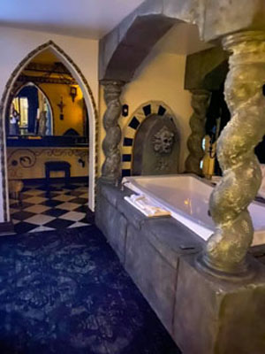 Two story mini mansion complete with its own mausoleum, crypt, graveyard and necropolis. Marble flooring and shower, granite countertops. Jacuzzi jetted tub for two with chromotherapy. The Lady of the manor spared no expense creating her time between time and place between place. Wood burning fireplace, microwave, mini fridge, Sony 4k Smart TV, queen size bed, Keurig coffee make